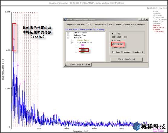 顯示存在明顯的軸承故障特征頻率,153Hz為該處軸承的外滾道故障特征頻率,244Hz為該處軸承的內(nèi)滾道故障特征頻率。綜上判斷,是該泵電機(jī)靠聯(lián)軸器端的軸承內(nèi)外滾道面缺陷,引起電機(jī)側(cè)振動(dòng)增長(zhǎng),更換潤(rùn)滑脂,故障仍然存在,建議拆檢電機(jī)更換軸承。