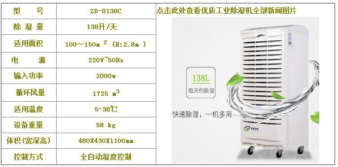 優(yōu)質(zhì)工業(yè)除濕機(jī)適用面積100-150m 2 左右,除濕量為138升/天,廣泛應(yīng)用于醫(yī)院以及生產(chǎn)車間,銀行金庫,檔案資料,圖書館,精密儀器室,貴重物品倉庫等場所。