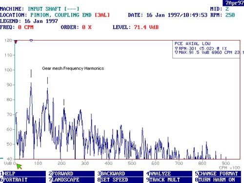 定期對齒輪箱中的潤滑油進(jìn)行分析,***后的報告指出油中含有鐵顆粒。維護(hù)主管詢問我們是否可以確定油污染的來源,我們做的***件事就是檢查軸承附近測得的振動頻譜。光譜看起來很正常,沒有軸承色調(diào)的跡象,因此我們懷疑金屬來自一個或多個齒輪(見圖2)。然后問題是識別故障齒輪(如果有的話),以便能夠毫不拖延地進(jìn)行維護(hù)工作。